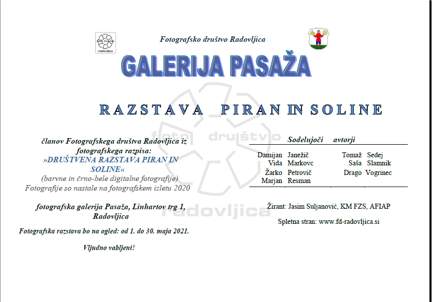 V fotografski galeriji Pasaža, Radovljiška graščina je v mesecu maju 2021 razstavljajo članice in člani Fotografskega društva Radovljica, ki so se udeležili vsakoletnega foto izleta. Lansko leto v oktobru nas je pot vodila v Piran in soline na Slovenski obali. Predstavljajo se z 28 fotografijami pejsažov, življenja in detajlov s Sečoveljskih solin in mesta Piran.