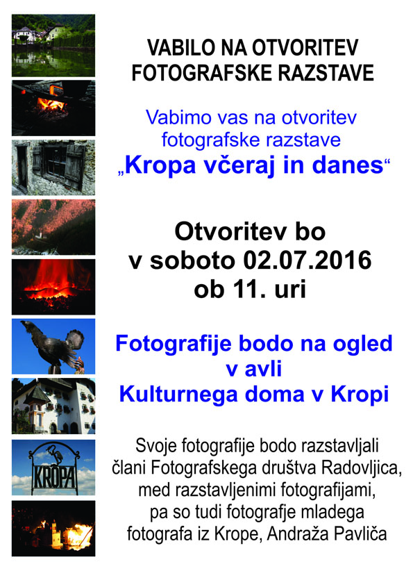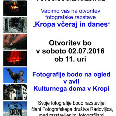V okviru Kovaškega šmarna 2016 je bila v soboto, 02. julija 2016 ob 11:00 uri otvoritev fotografske razstave Kropa včeraj in danes v avli Kulturnega doma v Kropi, Kropa št. 3. Organizirala jo je Krajevna skupnost Kropa. Razstavljalo je 8 članic in članov Fotografskega društva Radovljica in mladi fotograf Andraž Pavlič, domačin iz Krope. Fotografska razstava je na ogled od meseca julija, v času delovanja Knjižnice Kropa. Kropa je bila predstavljena, kot jo vidijo fotografi skozi objektiv fotoaparata. Prikazani so bili nevsakdanji pogledi na kraj, detajle, hiše ter delo in dela kovačev.