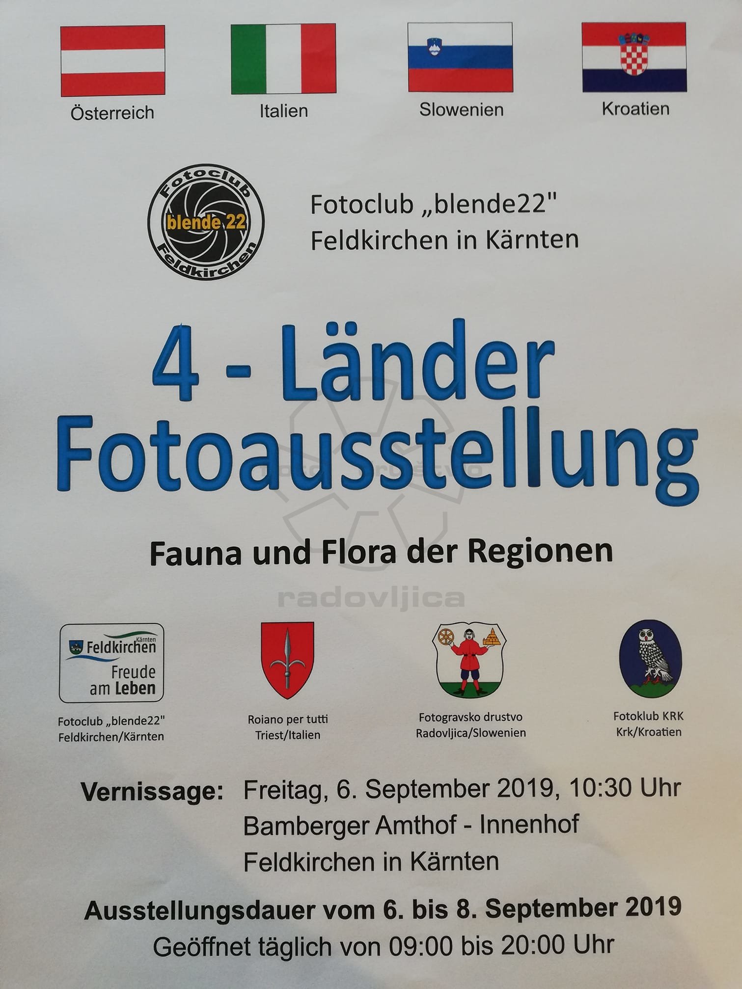 Feldkirchen na Koroškem – Avstrija. Dne 6. 9. 2019, je bilo odprtje foto razstave štirih obmejnih dežel, štirih sosednjih držav v kulturnem centru Bamberger Amthof. Sodelujoči na foto razstavi: Avstrija (Feldkirchen, Fotoclub »blende22«, predsedujoči Horst Maurer), Hrvaška (Krk, Fotoklub KRK, predsednica Marijana Kirasić-Nekić), Italija (Trst, “Roiano per tutti” Trieste, predsednica Doroteja Buttino) in Slovenija (Radovljica, Fotografsko društvo Radovljica, predsednica Vida Markovc). Tema je bila »Favna in flora regij«.