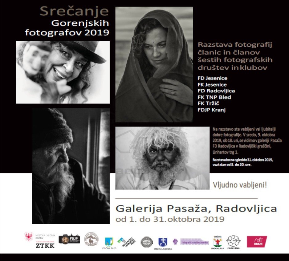 V fotografski galeriji Pasaža, Radovljiška graščina, Linhartov trg 1, v mesecu oktobru 2019 razstavljajo članice in člani fotografskih društvev in klubov z Gorenjske s temo črno-beli Portret. Letošnjega srečanja fotografov so se udeležili iz FD Jesenice, FK Jesenice, FD Radovljica, FK TNP Bled, FK Tržič in FD J. Puhar Kranj. Razstava bo obiskala vse občine, v katerih delujejo društva oziroma klubi. V Radovljici bo odprta od 1. do 31 oktobra 2019, njeno odprtje s kulturnim programom pa bo v sredo, 9. oktobra, ob 18 uri v avli Radovljiške graščine.
