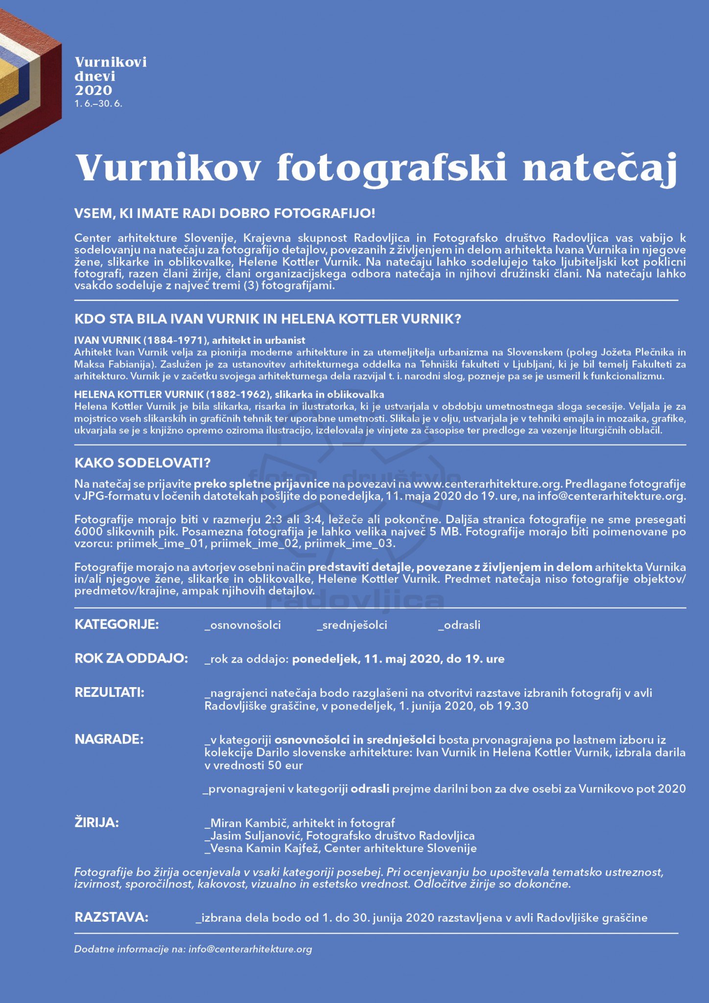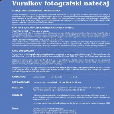 Center arhitekture Slovenije in Krajevna skupnost Radovljica ter Fotografsko društvo Radovljica smo izvedli fotografski natečaj povezan z življenjem in delom arhitekta, urbanista Ivana Vurnika in njegove žene slikarke, oblikovalke Helene Kottler Vurnik. Natečaj je del Vurnikovih dnevov ob prazniku Krajevne skupnosti Radovljica.