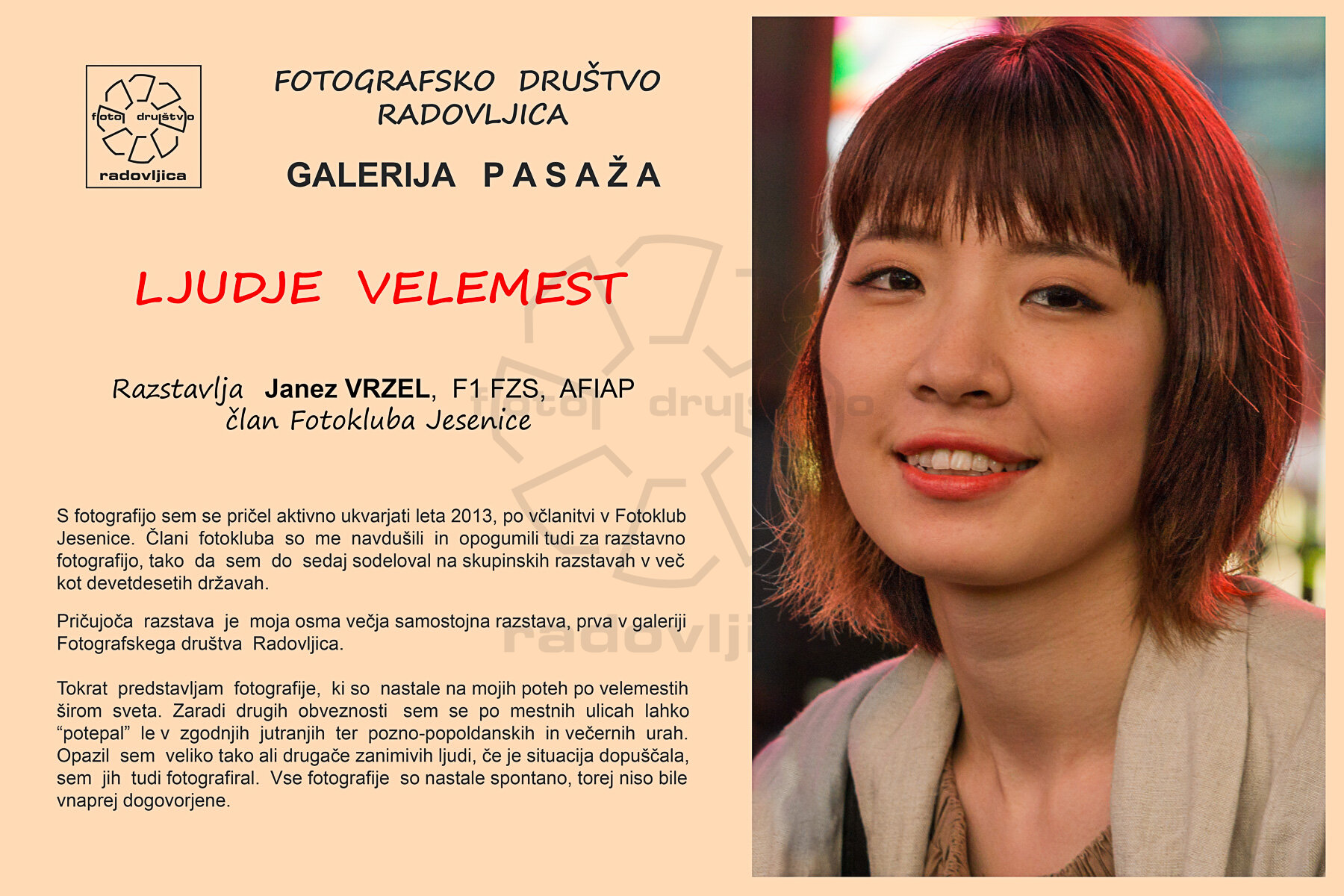 Pričujoča razstava je moja osma večja samostojna razstava, prva v galeriji Pasaža Fotografskega društva Radovljica.