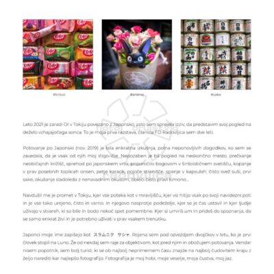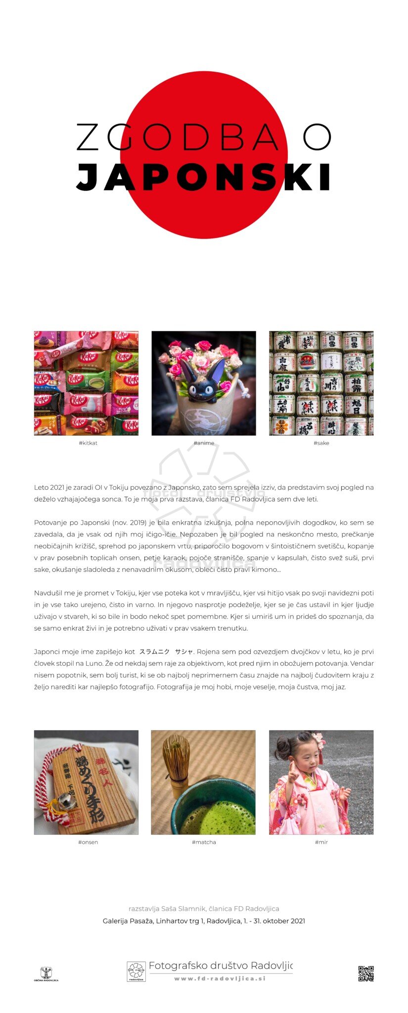 Zgodba o Japonski je nastala novembra 2019. Potovala sem turistično, v manjši skupini potnikov, katerim sem hvaležna, da so me večkrat prijazno čakali, ko sem od nekod prihitela z velikim nasmehom in navdušenjem nad dobrim posnetkom. Japonska me je povsem prevzela, uživala sem prav v vsakem trenutku. Majhen del tega predstavljam v razstavi.
