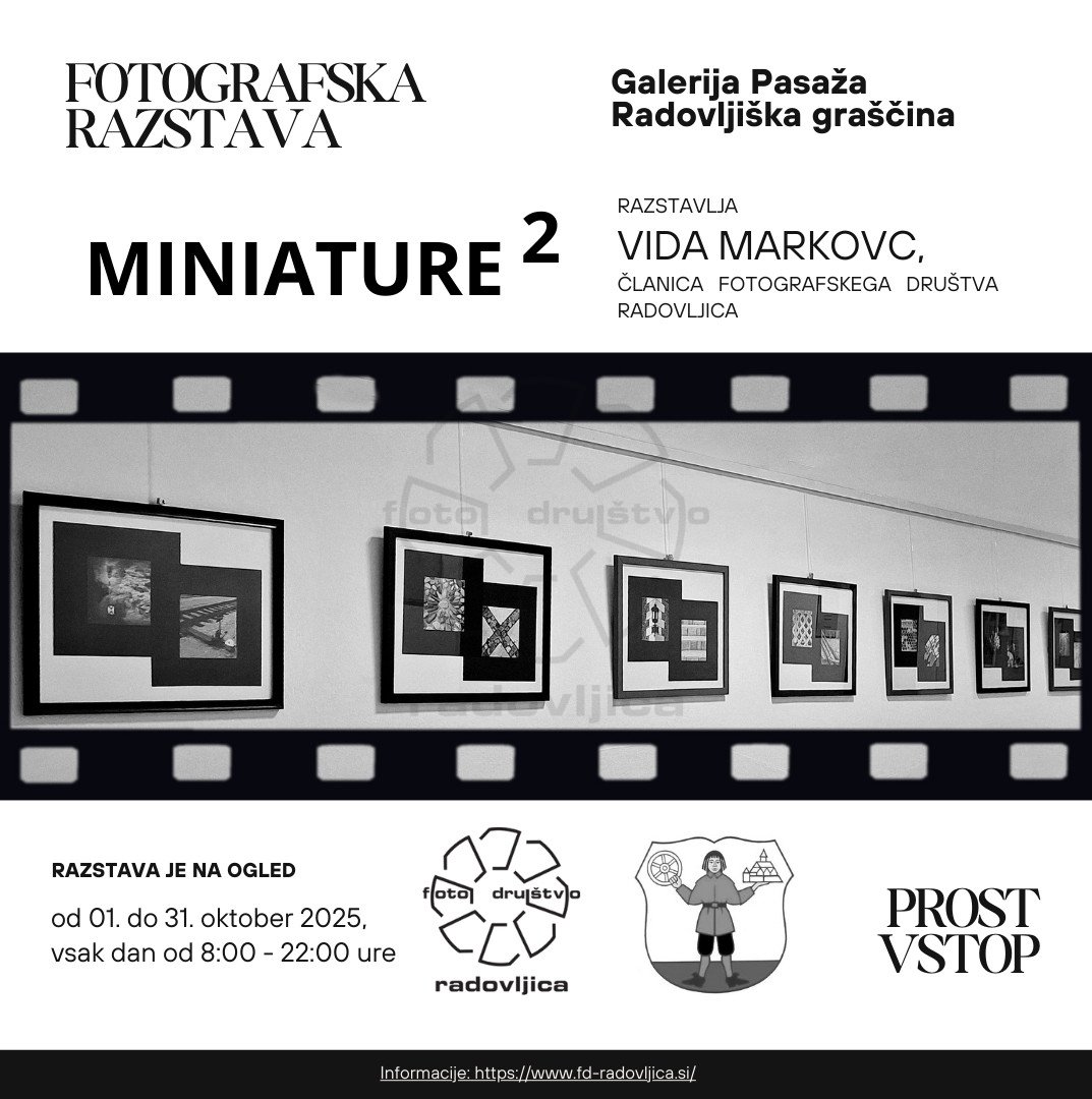 V mesecu oktobru 2025 vas vabimo v galerijo Pasaža Radovljiške graščine na Linhartovem trgu 1, kjer razstavlja Vida Markovc, F1 FZS, članica Fotografskega društva Radovljica s 30. samostojno razstavo z 58 fotografijami pod naslovom “Miniature2”, ki jih je ustvarila v letih članstva v fotografskem društvu.